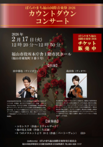 日 時:2月17日(火)12:20~12:50 場 所:福山市役所本庁舎1階市民ホール 料 金:無料 出 演:田中郁也(ヴァイオリン)、島田玲(ヴィオラ)